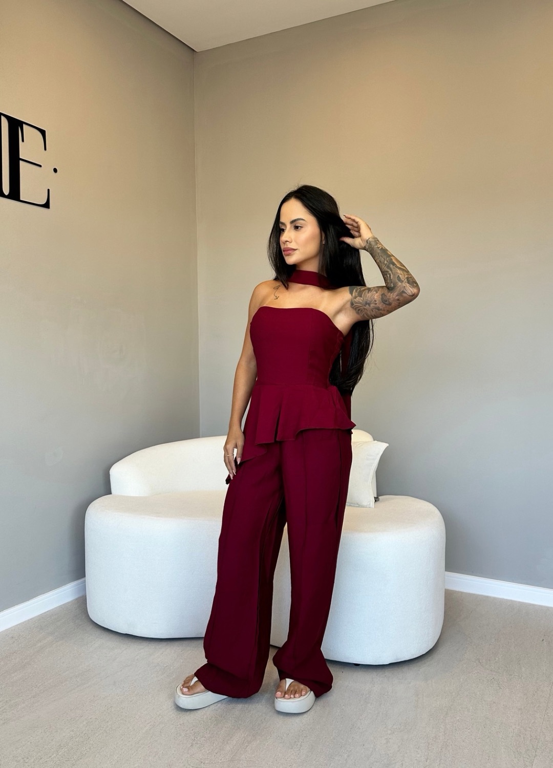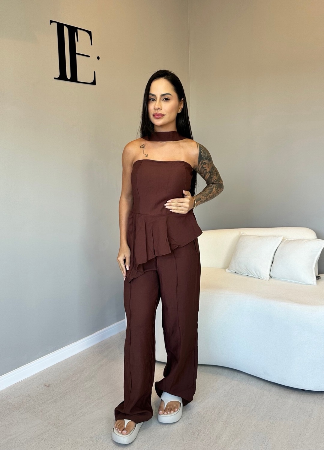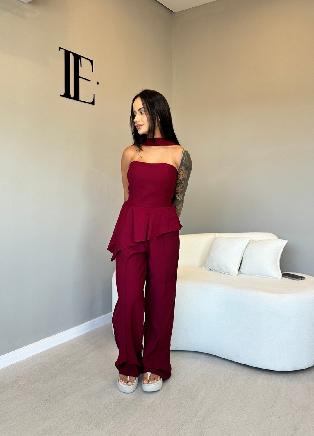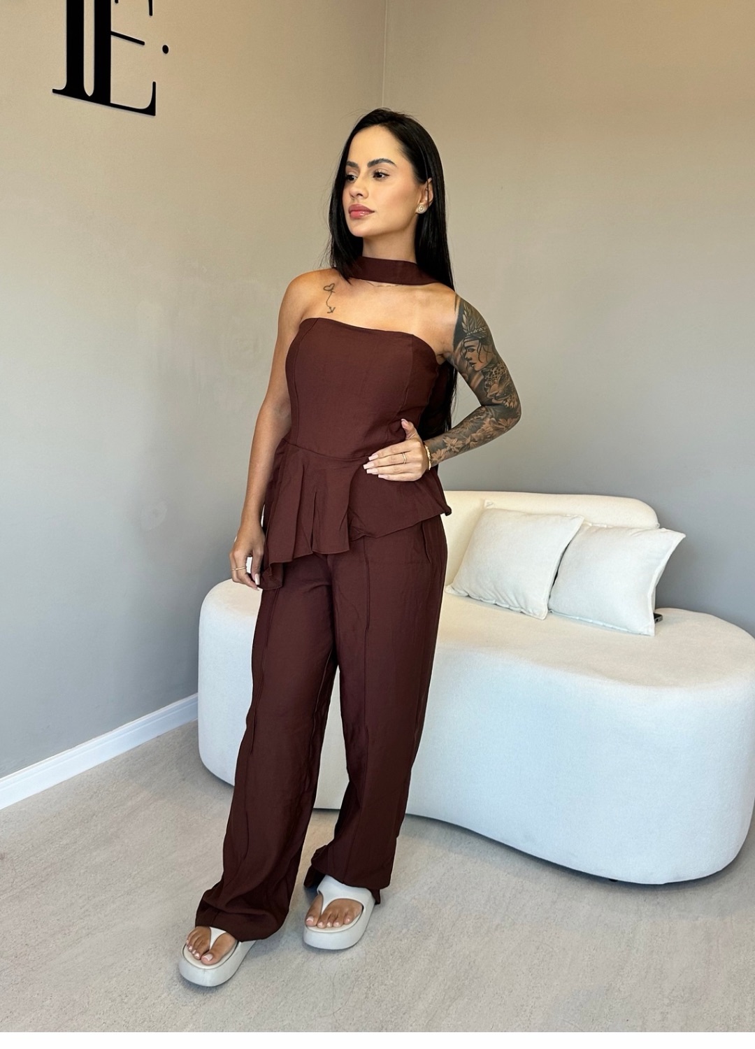 A blusa tomara que caia com corte peplum assimétrico valoriza a Silhueta com modernidade, enquanto a calça pantalona de cintura alta garante leveza e um efeito alongado irresistível.