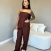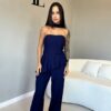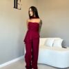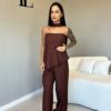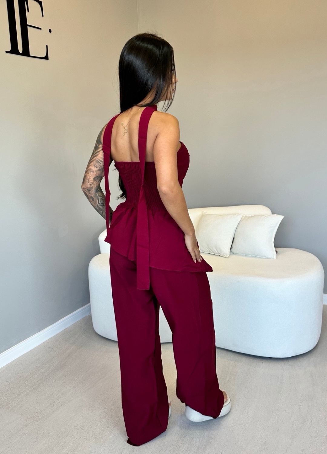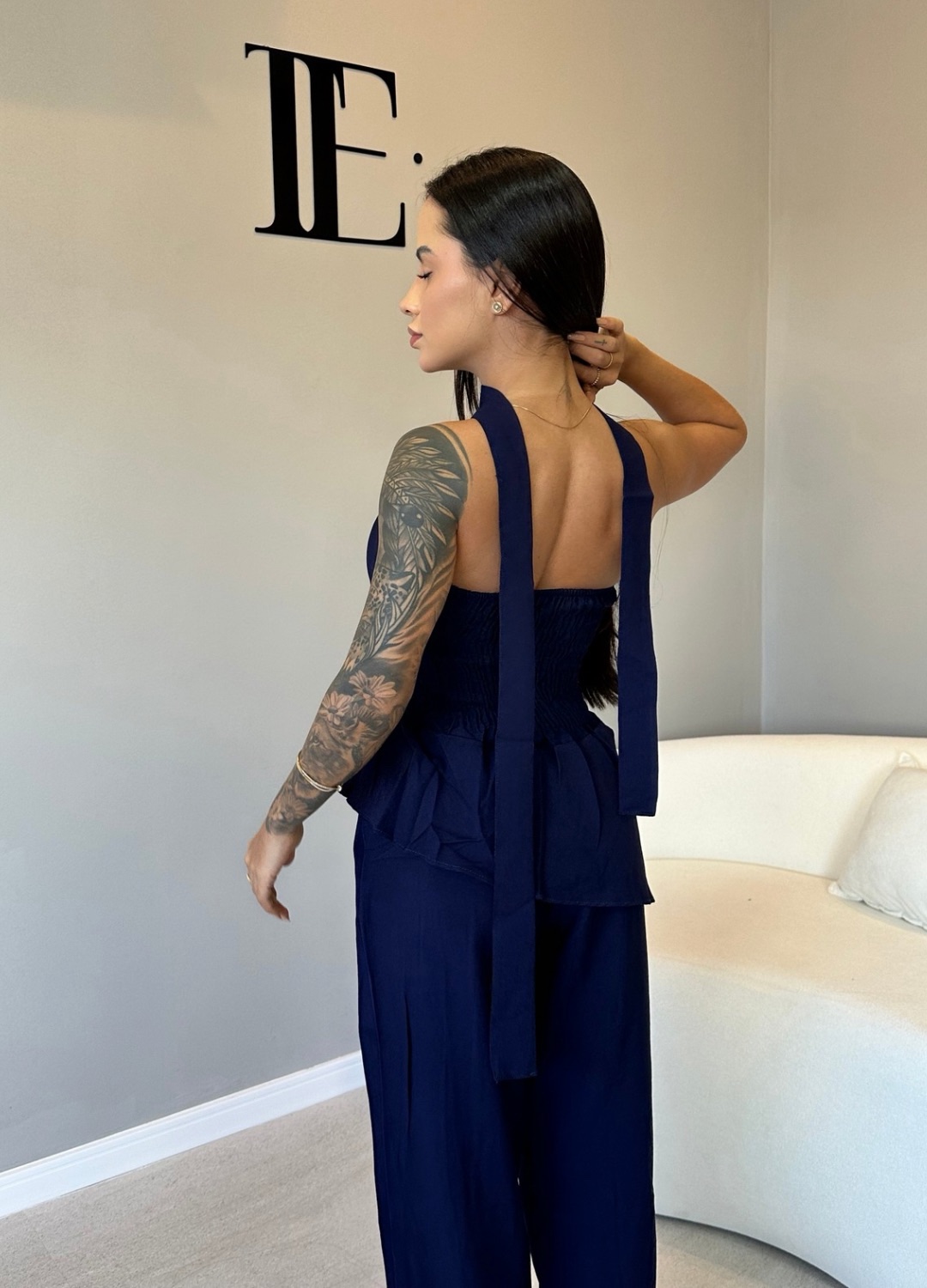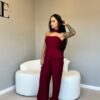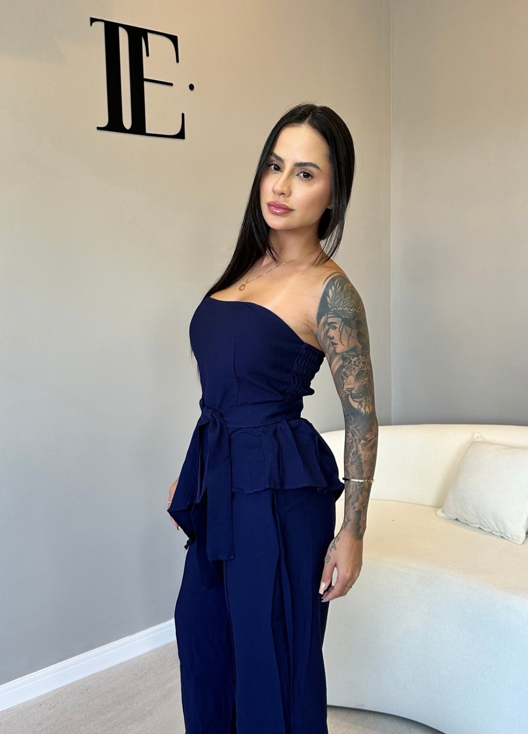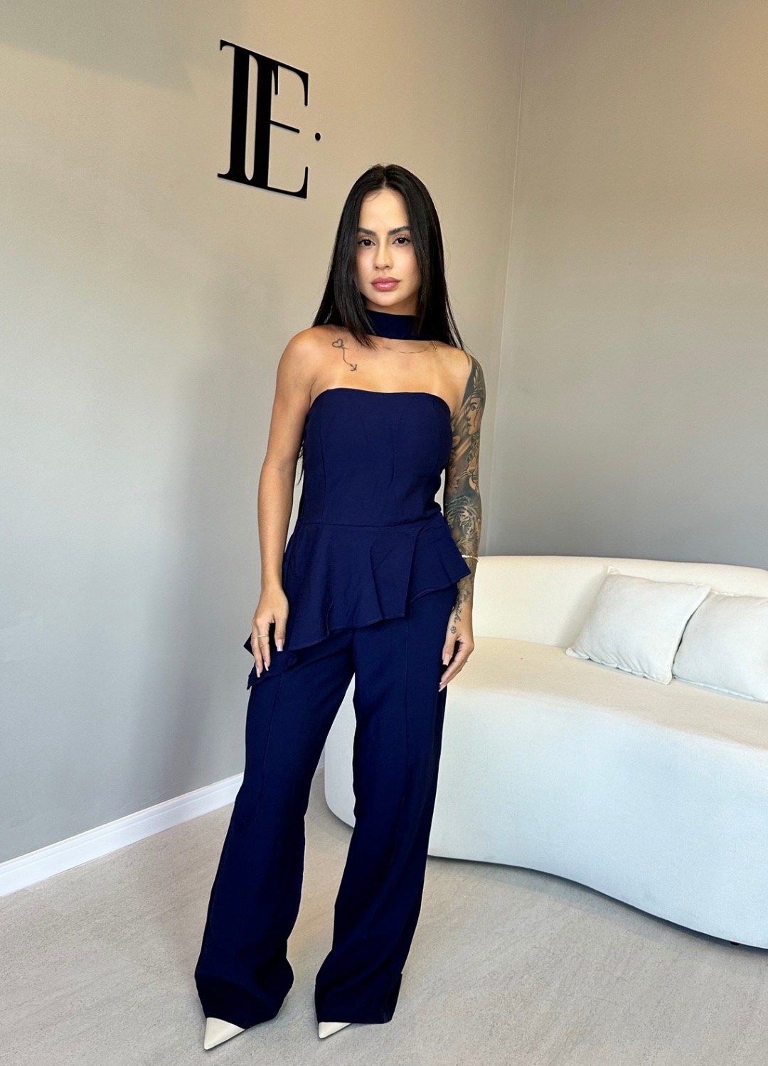 A blusa tomara que caia com corte peplum assimétrico valoriza a Silhueta com modernidade, enquanto a calça pantalona de cintura alta garante leveza e um efeito alongado irresistível.